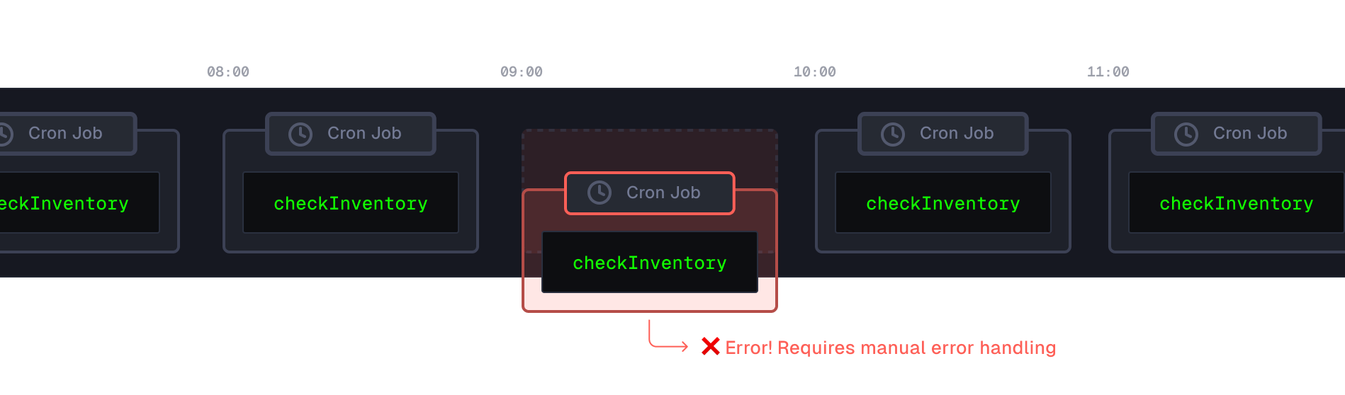 Additionally, if the server goes down or there's an unexpected delay, our Cron job tasks fail to execute and won't retry automatically. Unless we explicitly give the instructions to retry the failed Cron job, our UI will remain broken until at least 10:00, when the next Cron job is scheduled.