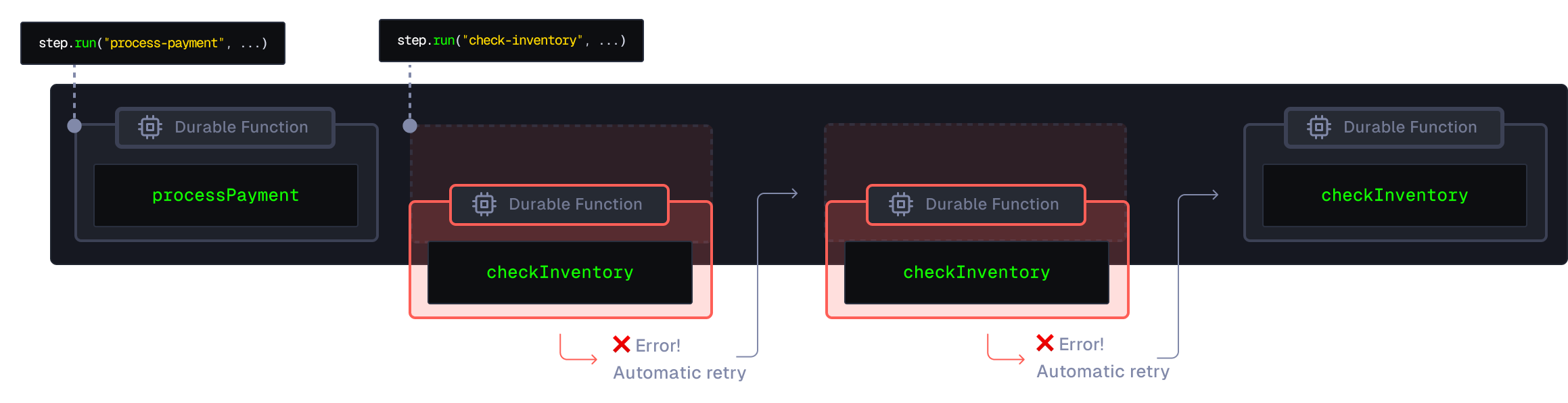 process-paymentas this is already memoized, and attempts to runcheck-inventoryagain. In this case, the second attempt succeeds.