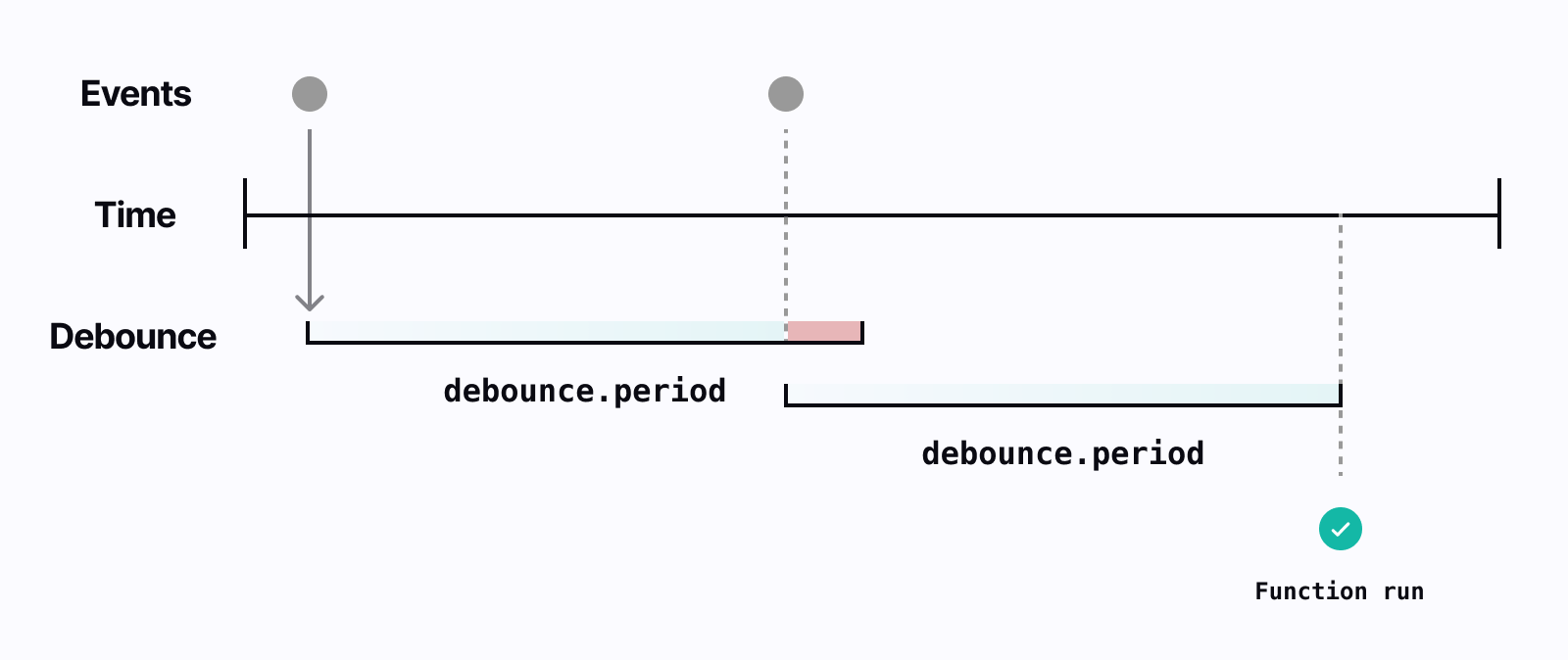 When a function is triggered, the debounce period begins. If another event is received that matches the function's trigger, the debounce period is reset. This continues until no events are received for the debounce period. Once the period has passed without any new events, the function is executed using the last event received.